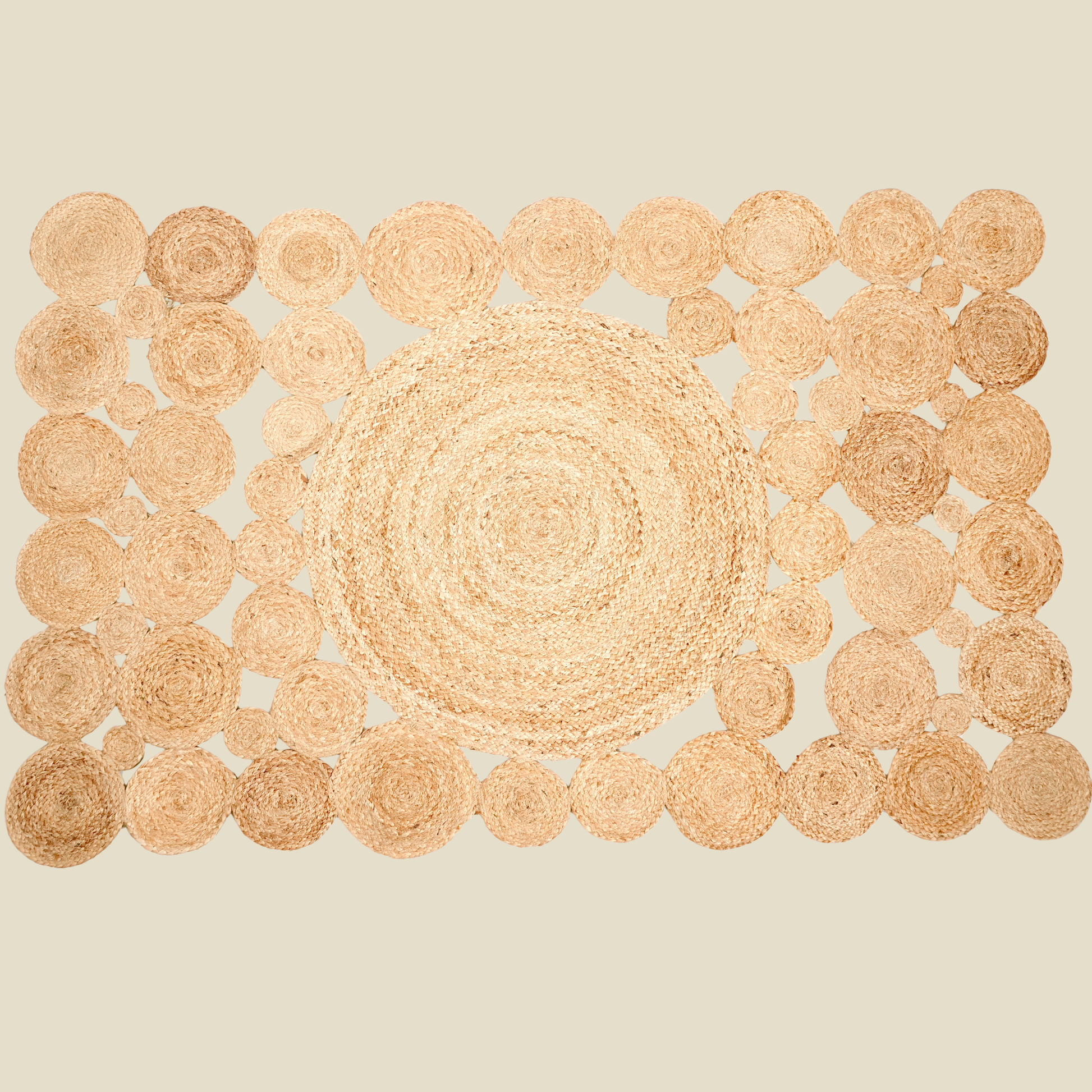 Designed to be styled in entryways, under coffee tables, or as a defining base in your living space, the Zarié Veda Handwoven Jute Rug with its structured weave design brings a sense of balance and grounding to your home. The connected circular detailing framed within a composed form creates a feeling of order and quiet strength, making it a natural fit for spaces that need both function and character.