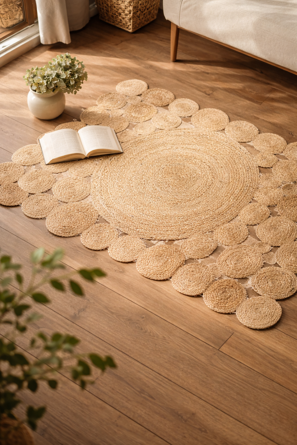 Perfect for entryways, under coffee tables, beside beds, or as a base element in living areas. Its structured form makes it ideal for spaces where you want the rug to define the layout while still blending with natural interiors.